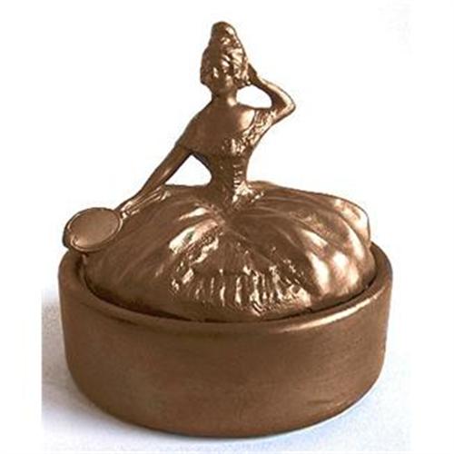 Produced in Ormolu or brass by the WB Manufacturing Co., circa 1930, and featuring an Art Nouveau lid with a Victorian Lady figural, in formal dress, holding a hand mirror. She measure about 4" tall and both the ornate lid and base is in excellent condition.