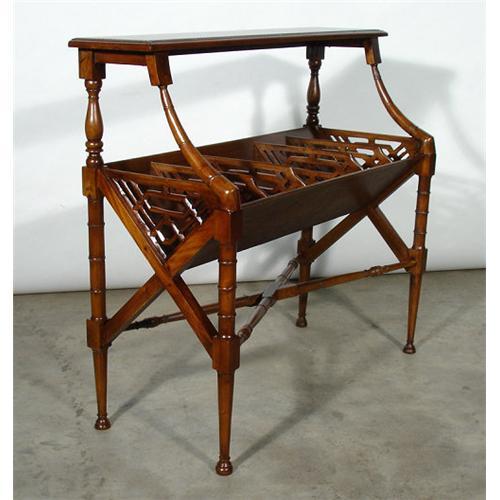 BUFFED IN A BEESWAX FINISH, THIS WALNUT FINISHED PIECE IS PERFECT IN EVERY WAY. SHELF ATOP, BOOK STORAGE BENEATH DIVIDE BY COMPARTMENTS. RAISED ON 4 TAPERED, TURNED LEGS. PLEASE BE SURE AND VISIT OUR SITE WHERE OVER 400+ ITEMS ARE LISTED FOR SALE. EMAIL US FOR ANY QUESTIONS AND AN APPRX SHIP QUOTE BEFORE BIDDING OR BUYING.BECAUSE OF ITS UNIQUE CRAFTSMANSHIP, HARDWARE & CARVINGS MAY VARY FROM PIECE TO PIECE.