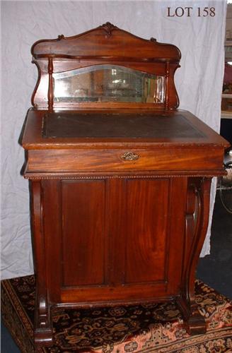 19TH CENTURY MAHOGANY DAVENPORT WITH SLANTED WRITING SURFACE, SIDE CABINET (WITH ORIGINAL KEY). 45" X 24"