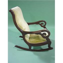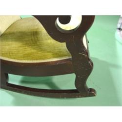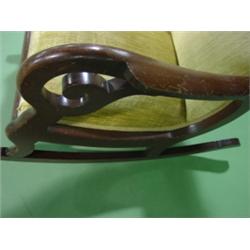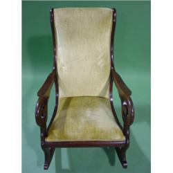 VICTORIAN MAHOGANY LINCOLN ROCKER. Yellow velvet upholstery shows some wear. Some scratching is visible on arms. 37.5" H to top of back, 24" W
