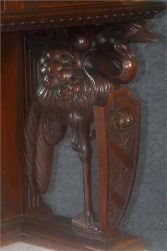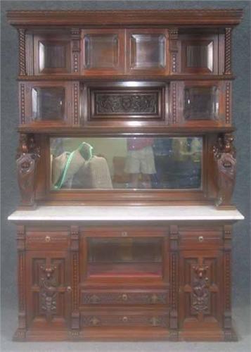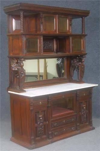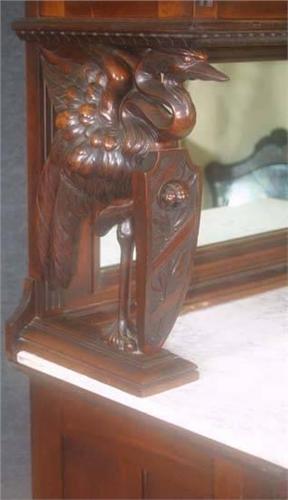 VICTORIAN MAHOGANY MARBLE TOP SIDEBOARD with full carved storks height: 87",width: 60" depth: 26" with five leafs