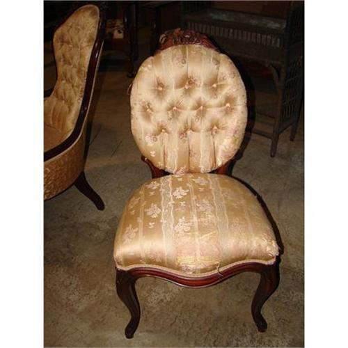VICTORIAN MAHOGANY FINGER CARVED SIDE CHAIR. Upholstered seat and back show signs of excessive wear. 37” H to top of back