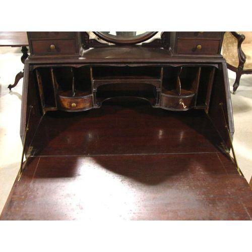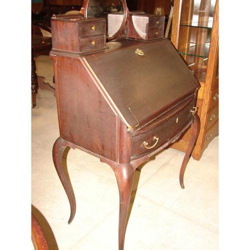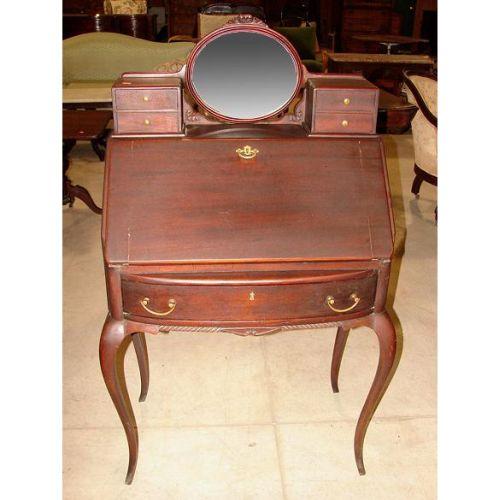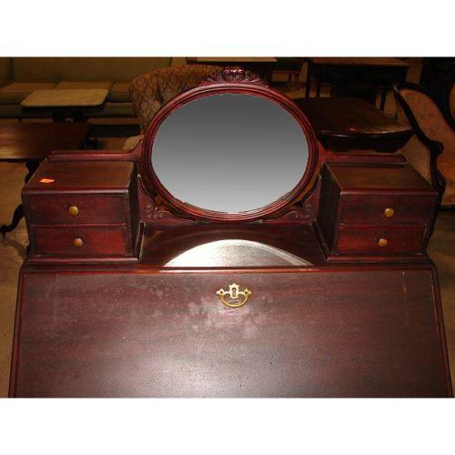 VICTORIAN MAHOGANY LADIES’ DROP-FRONT WRITING DESK. Two mortised drawers at each side with central beveled oval mirror over hinged pull-down slant lid over dovetailed drawer. On cabriole legs. 51” H, 29” W, 19” D