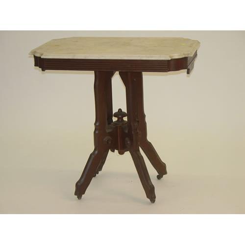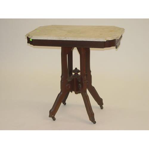 VICTORIAN MARBLE TOP BLACK WALNUT LAMP TABLE - EASTLAKE STYLE W/ SHAPED MARBLE TOP & CARVED BASE (29 1/4" T X 30" L X 20 3/4" W) - WEAR, STAINS & SCRATCHES, IMPERFECTIONS
