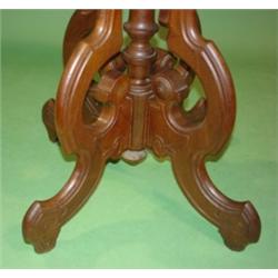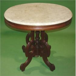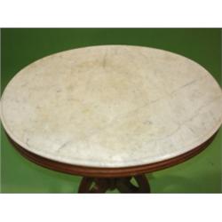 VICTORIAN WALNUT TABLE WITH WHITE MARLBE TOP. Staining to top of marble. Base is in good cond. 29"H, 29"L, 22" D.