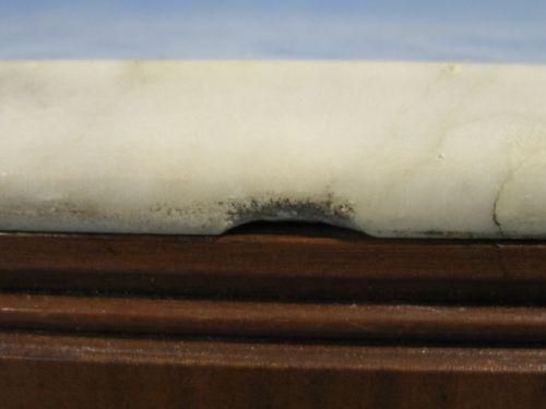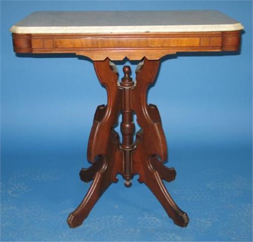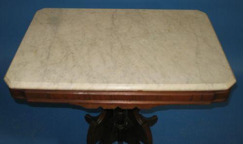 VICTORIAN WALNUT MARBLE TOP TABLE. Small amount of staining to white marble top. One small chip to edge of marble at front. 28.5” H, 29” W, 18.75” D