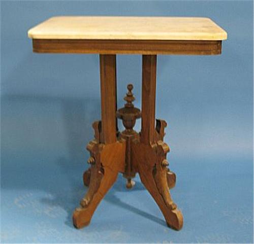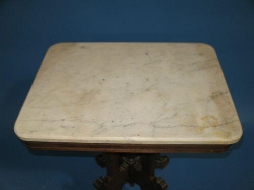 VICTORIAN WALNUT MARBLE TOP TABLE. Small amount of staining to white marble top. Ornately carved finial at center of base. 28.25” H, 25.5” W, 19.25” D