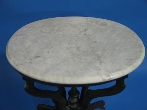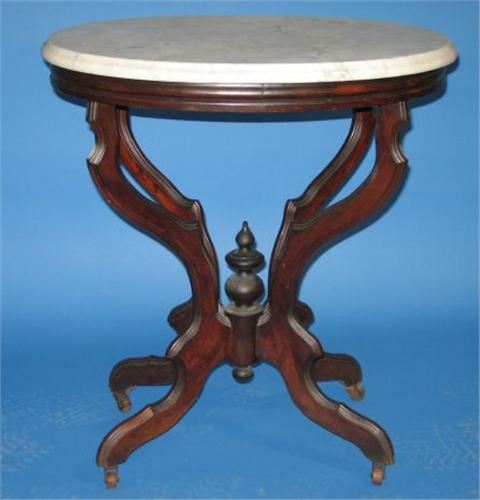 VICTORIAN WALNUT OVAL MARBLE TOP LAMP TABLE. Small amount of staining to white marble top. Carved finial at center of base. Feet rest upon castors. 28.25” H, 24.5” W, 19” D