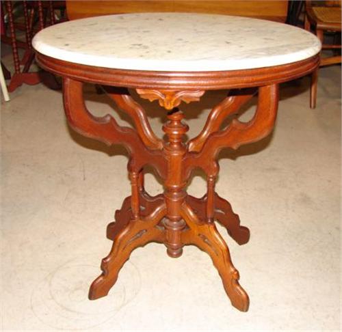 VICTORIAN WALNUT OVAL MARBLE TOP LAMP TABLE. Ornate base. White marble top. 28” H, 26.5” L, 18.5” W