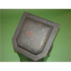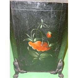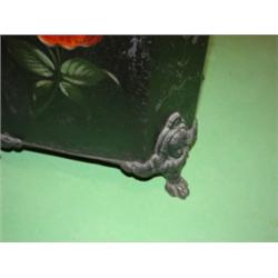 VICTORIAN METAL COAL CONTAINER WITH REMOVABLE BUCKET ON INSIDE. Good overall cond. Decorated with flowers on front. Ornate feet. Painted with black piant. Victorian era. 24"H, 11"W,