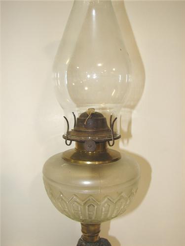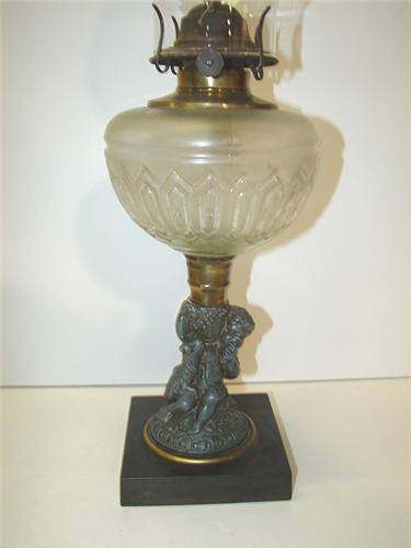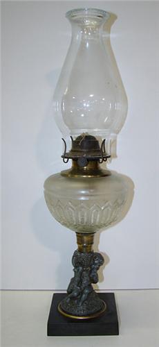 VICTORIAN METAL STEM OIL LAMP. Figural metal stem depicts a cherub with lamb. Clear glass bowl. Non-electrified. 19.75” H to top of chimney.