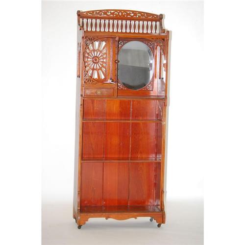 VICTORIAN MIRRORED ETAGERE BOOKCASE - BLACK WALNUT AESTHETIC MOVEMENT STYLE BOOKCASE W/ PIERCED CARVED & SPINDLED GALLERIES & FRAMING, MIRRORED BACK, SM. DRAWER, ADJ. SHELVES & SHAPED BASE (74"T X 30"W X 13.5"D) - WEAR, STAINS, LOSSES & REPAIRS