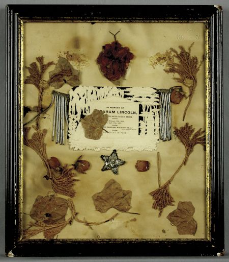 An 1865 Victorian mourning collage featuring an impressive bas-relief card mourning Abraham Lincoln quoting his second inaugural address: "'WITH MALICE TOWARD NONE, WITH CHARITY FOR ALL.'" housed in a period frame with dried flowers and leaves as well as remnants of an officer's metal epaulets and a black and silver star. Backing age toned, else very good condition.