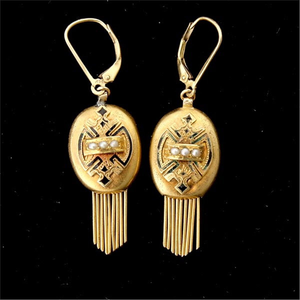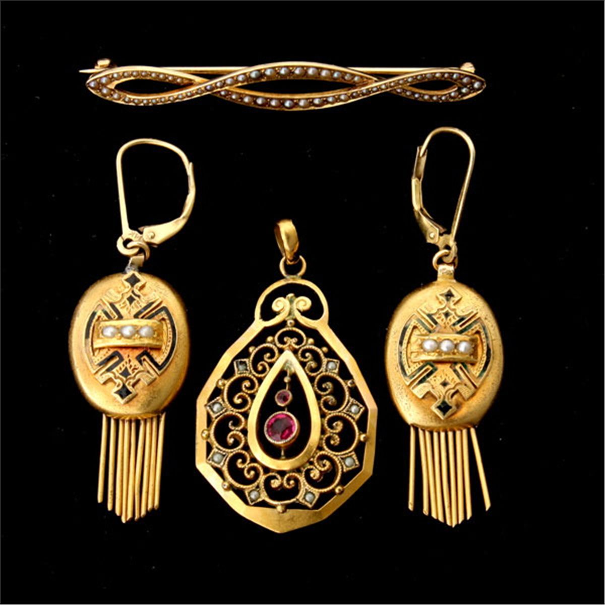 COLLECTION OF VICTORIAN MULTI-STONE, 14K Y/G, YELLOW METAL JEWELRY. Including a seed pearl, 14k yellow gold bar pin, a pair of seed pearl, enameled, 14k yellow gold earrings (ear wires are modern) and a pink stone, yellow metal pendant.