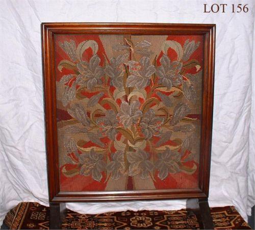 VICTORIAN NEEDLEPOINT FIRESCREEN, THE MAHOGANY FRAME SURROUNDING A BEADWORK AND NEEDLEPOINT (FLORAL) SCREEN, RAISED ON BRACKET FEET. 27 1/2" x 21 1/2"