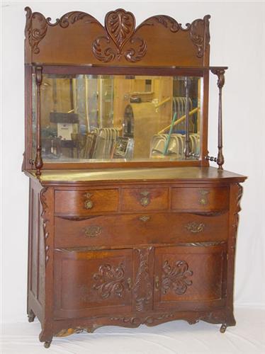 VICTORIAN OAK 2 PC. MIRRORED BACK GALLERIED SIDEBOARD W/ APPLIED CARVING (48" W X 25" D X 75" H) - LOSSES, WEAR & IMPERFECTIONS