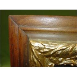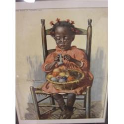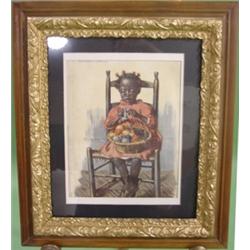 VICTORIAN OAK & GILT DECORATED FRAME with Black Americana print. Print depicts young girl sewing. 20" x 23.5" framed.