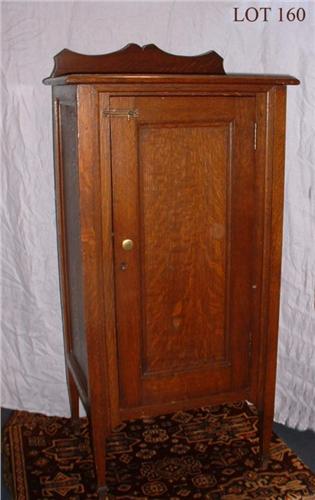 TURN-OF-THE-CENTURY OAK MUSIC CABINET WITH CARVED BACKSPLASH, DOOR OPENING TO MULTIPLE SHELVES. 46" x 22"
