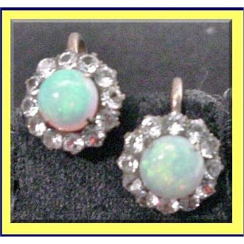 Pair of earrings in opals and white saphires (that look like diamonds). Gold screw-on setting. Made late 19th - early 20th century.