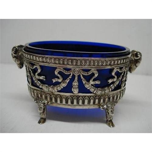 GORGEOUS VICTORIAN STYLE OPEN CONDIMENT DISH, STUNNING OPEN WORK IN 800 SILVER, SHOWING DELICATE GARLANDS AND BOWS AND TASSELS OVER COBALT BLUE LINER,LOVE THE FIGURAL RAMS HEADS AS A HANDLES AND STANDING ON RAMS FEET WITH HOOFS AND SUPORTED WITH 4 RAMS HEADS, JUST EXQUISITE!, It stands 1 3/4" high and about 3 1/2" x 2" wide, Excellent condition, free of damage,US Buyer to pay 7.00 foe shipping plus insurance.THANKS.