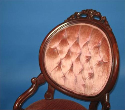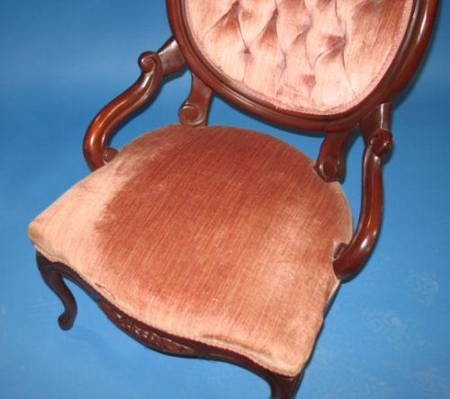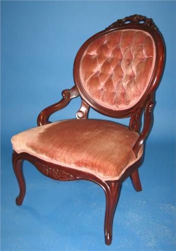 VICTORIAN ROSEWOOD PARLOR CHAIR. Ornately carved decoration at top of back and at bottom of seat. Mauve upholstered back & seat. 36” H to top of back, 24” W, 15.5” H to top of seat