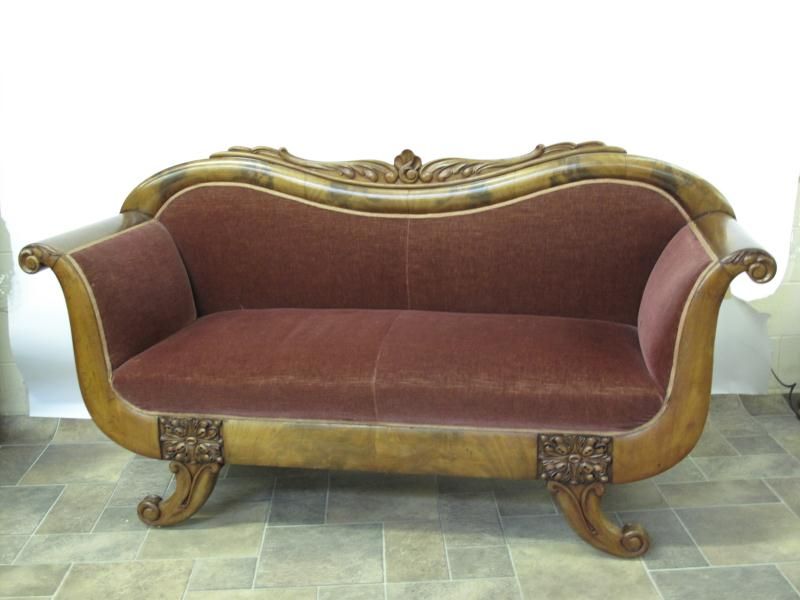 -with a carved oak frame and red upholstery.
