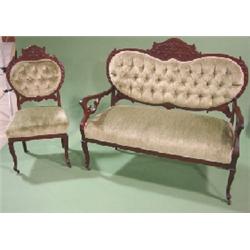 TWO PIECE VICTORIAN PARLOR SUITE. Consists of love seat and side chair. Green upholstered backs and seats. Overall good condition. Ornately carved. Chair: 42” H to top of back, 19” H to top of seat, 21” W. Love seat: 44.5” H to top of seat, 22” H to top of seat, 49” W