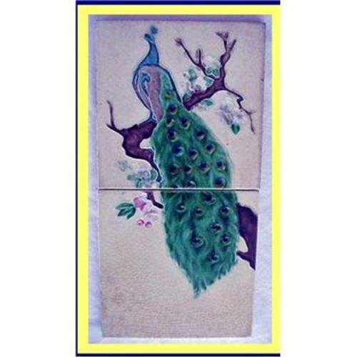 Relief moulded. Taken from a Victorian home, pair of wall / fireplace tile plaque depicting a peacock nesting in a blossom tree. Much in the Arts And Crafts taste. Made in England, circa 1880-90. Factory signed on the back.<BR>Each tile measures 6 X 6 inches.<BR>Together the tiles depict a magnificent peacock sitting in the branches of a very Japanese looking blossom tree. The Victorian, Arts and Crafts admiration for the Japanese is clearly shown . Beautiful detail to the moulding of the bird and background - gently relief moulded and wonderful tonality of warm, deep colours. <BR>Marked on the back with the factory name: RICHARDS ENGLAND. Also, a number of other raised marks and numbers - some shown in photos. <BR>Tiles are in good, original condition with crazing typical of English ceramics of that age.<BR>Clear evidence that tiles were actually removed from their original setting and some commensurate wear on the back, not visible in front of tiles.