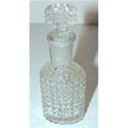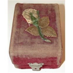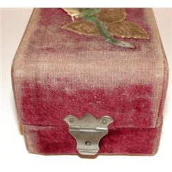 VICTORIAN PERFUME BOTTLE CASE WITH TWO BOTTLES. Decorated on top with wooden & embroidered flower. Original latch. Both studded perfume bottles have stoppers and are in good condition. Case shows signs of wear. Bottles: 4" H. Case: 3" H, 3.5" W, 4.5" L
