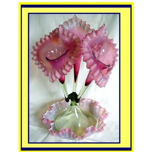 Cased opalescent glass, pearly white in parts, pink running to ruby red stems in others. Base has frilly edges in pink and white with a conical center that