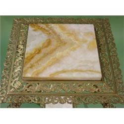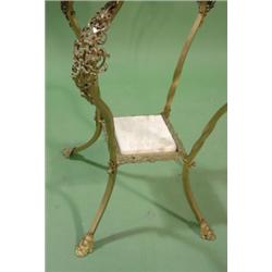 VICTORIAN BRSS PLANT STAND WITH MARBLE TOP & BOTTOM. Ornately decoration brass frame. 30.25" H, 16" W, 16" D