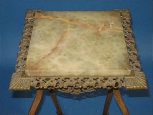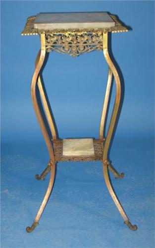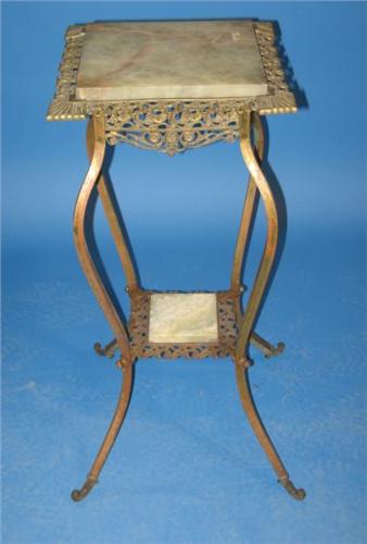 VICTORIAN BRASS & MARBLE PLANT STAND. Ornate brass frame holds two sections of jade colored marble. 31” H, 14” W, 14” D