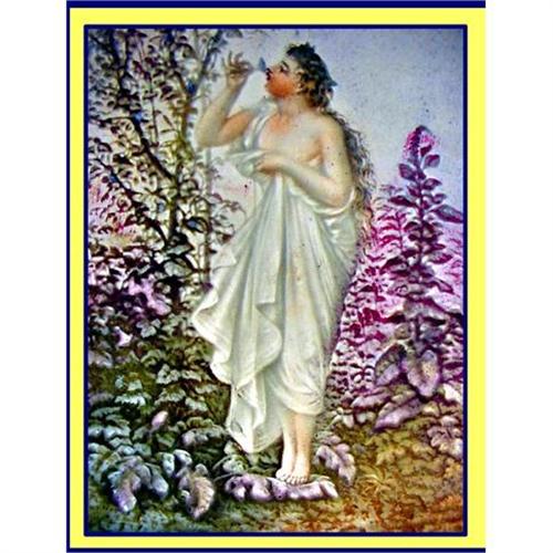 Rare Victorian hand cut and hand coloured lithopane depicting a Roman toga clad woman smelling flowers in a garden setting.<BR>Comes in stained glass frame.<BR>Frame measures just under 7 3/4inches wide X 8 5/8inches high. Lithopane is 4 X 4 3/4inches.<BR>Strong Pre-Raphaelite influence on this lithopane in which a toga clad woman with long, flowing hair smells a flower. She stands amidst a garden of purple flowers, trees and grassy outcrop. Great detail. It is rare to find a coloured lithopane.<BR>Impressed PR in a ballon signature as well as impressed 1308. Stained glass frame in blue and purple.<BR>Condition is excellent. No chips/cracks/damage of any sort.