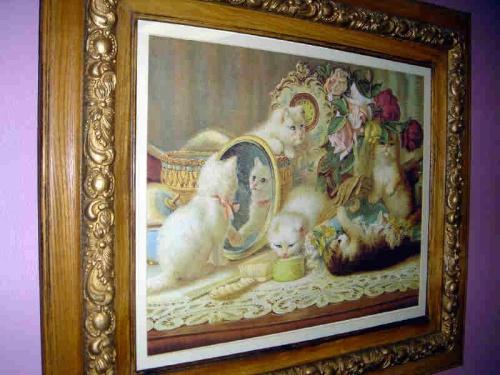 VICTORIAN PRINT CATS IN WOODEN FRAME