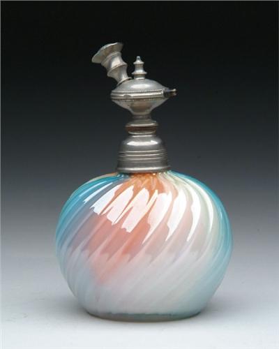 VICTORIAN RAINBOW ATOMIZER. This outstanding Victorian atomizer features swirled rainbow colors of blue, peach and yellow cased beneath a clear glass swirl rib outer layer. Bottle is topped with a white metal atomizer assembly. SIZE: 5-3/4 in. t. CONDITION: Atomizer ball is missing, otherwise very good. 5-61232