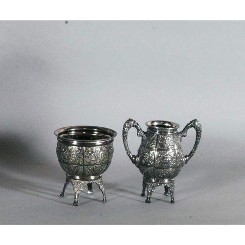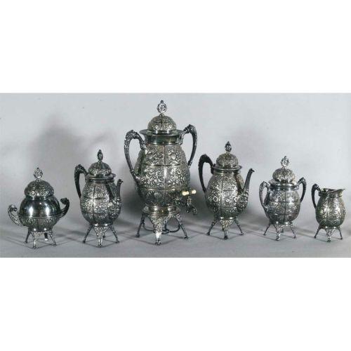 VICTORIAN REPOUSSE PLATED TEA SET, 8 pieces, by Meriden, largest 17" high, lacking some lids circa 1880 CONDITION REPORT: lacking 2 lids, another possibly mismatched. PACKING AND SHIPPING: offered by Fairfield Auction to points within Continental U.S.A. and excluding insurance (which will be required and added) $50.