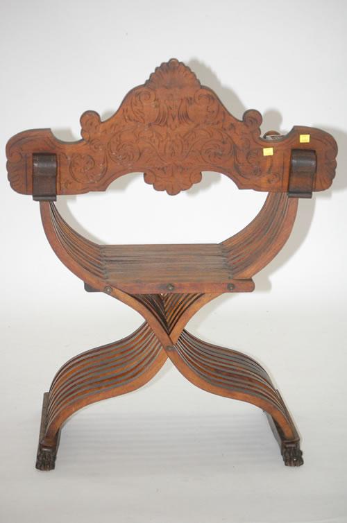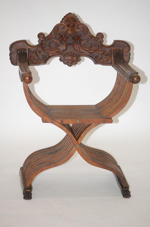 VICTORIAN REVIVAL ARMCHAIR - ROMAN REVIVAL X FORM WALNUT ARMCHAIR W/ GRIFFIN CARVED CREST, BASKETED SEAT, INVERTED BASKET BASE & PAW FEET (38" T X 25" W X 23" D) - WEAR, IMPERFECTIONS