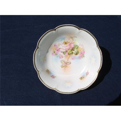 GORGEOUS GERMAN BOWL WITH BEAUTIFUL CLUSTERS OF LARGE AND SMALL PINK ROSES WITH LIGHT BLUE SHADING. AN EYECATCHING PIECE IN FANTASTIC CONDITION WITH NO CHIPS CRACKS HAIRLINES OR REPAIRS. 8" IN DIAM.