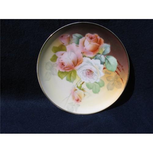 GORGEOUS HAND PAINTED ARTIST SIGNED BAVARIAN ROSE PLATE FEATURING A CLUSTER OF PINK ORANGE AND WHITE ROSES. BEAUTIFUL TO LOOK AT AND IN