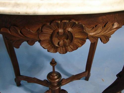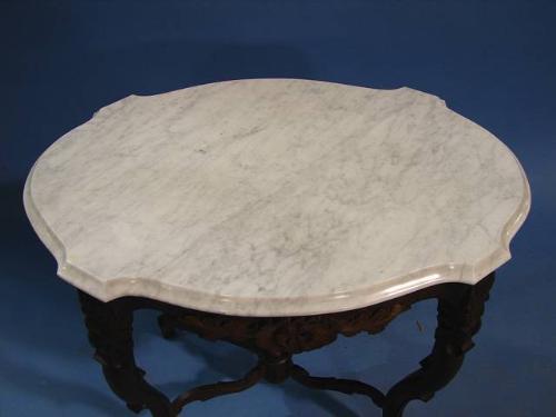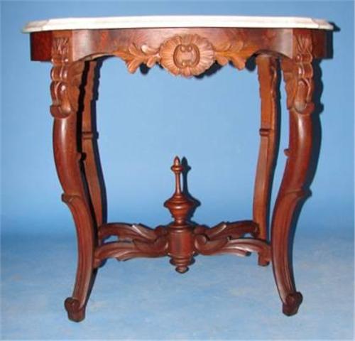 VICTORIAN ROSEWOOD MARBLE TOP LAMP TABLE. Ornately carved. White marble top. Cabriole legs. 29” H, 30.5” W, 20” D