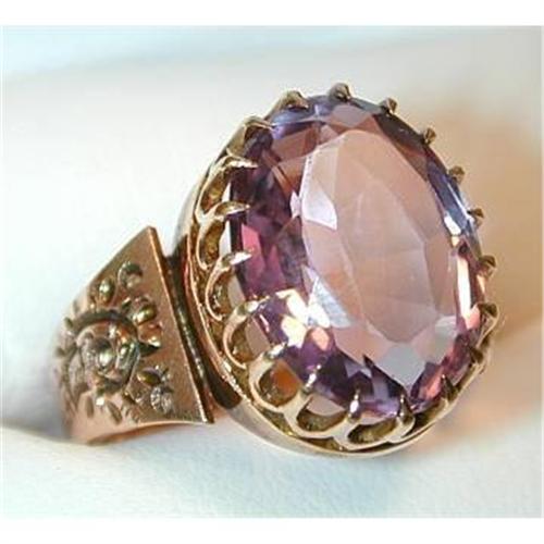 A simply lovely Early Century ring in 14k Rose Gold that features fine detailing and a large oval faceted Amethyst. The stone measures 1/2" in a multiprong setting the sides of the band have fine floral details that add interest to the design. The ring is a size 7 (it can be resized by your jeweler) unmarked and testing to 14k. In excellent condition and a very fine and unique ring(#4748)