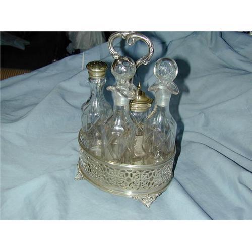 Beautiful Victorian condiment set, composed of frame, a mustard, salt and oil and vinegar bottles. In great condition.