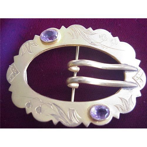 Wonderful Victorian gold sash brooch with lovely floral engraving and with two facetted glass amethyst colored stones in the form of a large buckle. This is a most beautiful large brooch being of a heavy gold plate with a dore finish, no worn areas, just perfect condition. It measures about 2 ½ inches by 1 ¾ inches. It has its original working c catch which closes securely. A fabulous Victorian brooch to enjoy wearing and adding to your collection of Victorian jewelry.