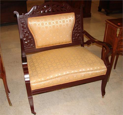 VICTORIAN OVERPAINTED SETTEE. Settee has been overpainted with brown paint. Has ornately carved leaf decoration at back. Yellow upholstery at back and seat. 37.5" H to top of back, 32.5" L