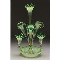 VICTORIAN SHADED OPAQUE AND GREEN GLASS EPERGNE, the central trumpet surrounded by three smaller...