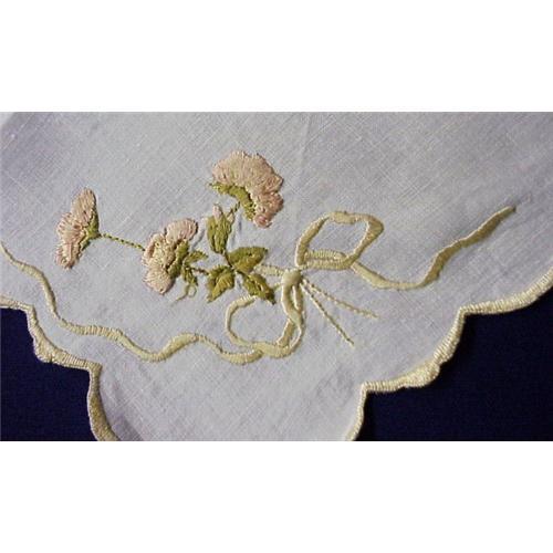 FABULOUS VICTORIAN EXAMPLE OF HAND EMBROIDERY IN SILK THREAD ON THE FINE WHITE LINEN,DEPICTING BEAUTIFUL SILK PINK ROSES WITH SHADED - IN TWO COLORS- LEAVES, AND ART NOUVEAU STYLE BOWS,VERY DETAILED AND OF HIGH QUALITY EMBROIDERY WORK, THIS VICTORIAN CENTER PIECE MEASURES ABOUT 15 1/4" X 11 1/2" - IT IS IN EXCELLENT CONDITION, READY TO USE. US BUYER TO PAY 3.00 FOR SHIPPING PLUS INSURANCE.THANKS.