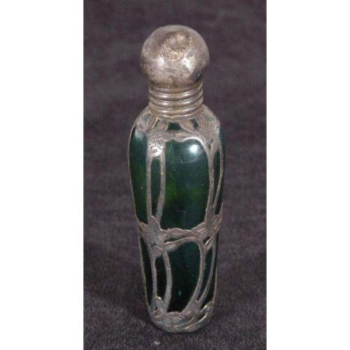 VICTORIAN SILVER OVERLAY SCENT BOTTLE, green glass, 4 3/8" high, dent to cap, circa 1900, CONDITION REPORT: two dents to cap. PACKING AND SHIPPING: We offer packing (double boxed in most cases) and shipping of this item within the Continental United States by USPS or UPS (our choice- boxes over 30lbs or oversized may be recalculated based on buyer's location), NOT INCLUDING INSURANCE (it will be added when we know the sales price) for $20
