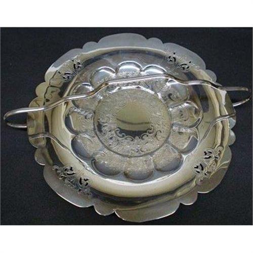 Lovely antique silver plated fruit dish with deco style handle, depicting pretty piercing design,showing amongst the scrolls and pierecing lovely group of fruit, as per picture - Excellent used condition, no dents or "bold" spots - Measures about 10 3/4" in diam. and about 4" high, US Buyer to pay 10.00 for shipping, plus insurance.THANKS.