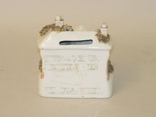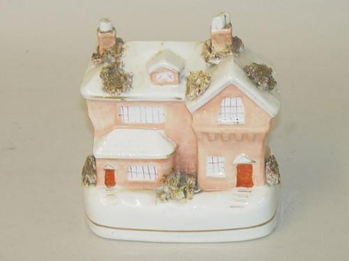 VICTORIAN STAFFORDSHIRE COTTAGE FIGURINE STILL BANK- PINK HOUSE W/ 2 CHIMNEYS (4 1/2" T X 4" W X 2 1/4" D)- WEAR, SPIDER ON BASE, IMPERFECTIONS