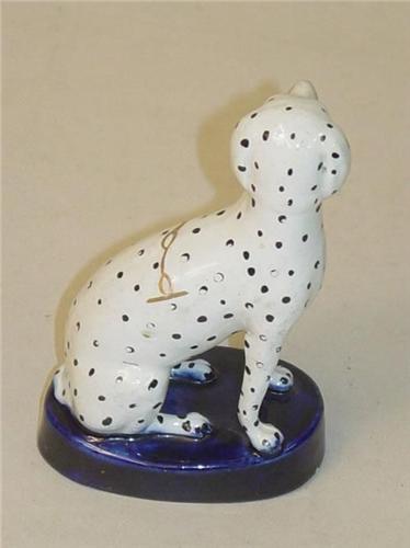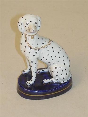 VICTORIAN STAFFORDSHIRE DOG FIGURINE-SPOTTED DALMATIAN W/ GOLD COLLAR & CHAIN (5" T X 3 3/8" W X 2 1/8" D) - WEAR, 1/4" BASE CHIP, IMPERFECTIONS